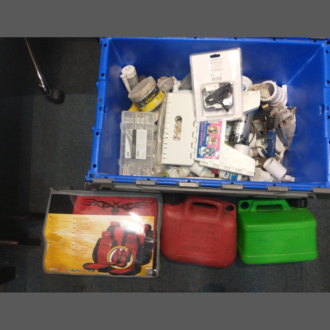 A box with a quantity of plumbing supplies, two jerry cans, a car seat cover set.