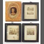 A small Victorian miniature portrait of a pretty young girl. Frame worn and image faded. Also three other framed miniature Baxter oil colour prints.