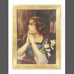 An antique oil and board painting of a pretty young lady gazing skywards with hands clasped in contemplative prayer. Unsigned. 43cm x 33cm frame size approx. One minor hole in canvas by her left shoulder.