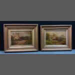 Two original EDWARDIAN gilt framed oil on canvas paintings of country scenes, one and idyllic country cottage and the other with sheep and a windmill. Signature indistinct (S Mc?) but dated 1910, frame size 52 x 44cm approx