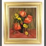 An oil on board still life of a vase of flowers. Nice ornamental heavy gilt frame. Measures approx 60x53cm. Frame with some damage. Such a pretty posy of summer bloom flowers. Signed to the base with indistinct signature.