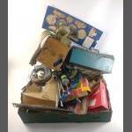 Small lot of automotive interest to include head lamps, wing mirrors, boxed wipers, grease gun, foot pump, cables and others.