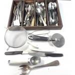 A cutlery tray with useful contents of cutlery and kitchen implements including ice cream scoop, pizza cutter, small sieve tin opener etc