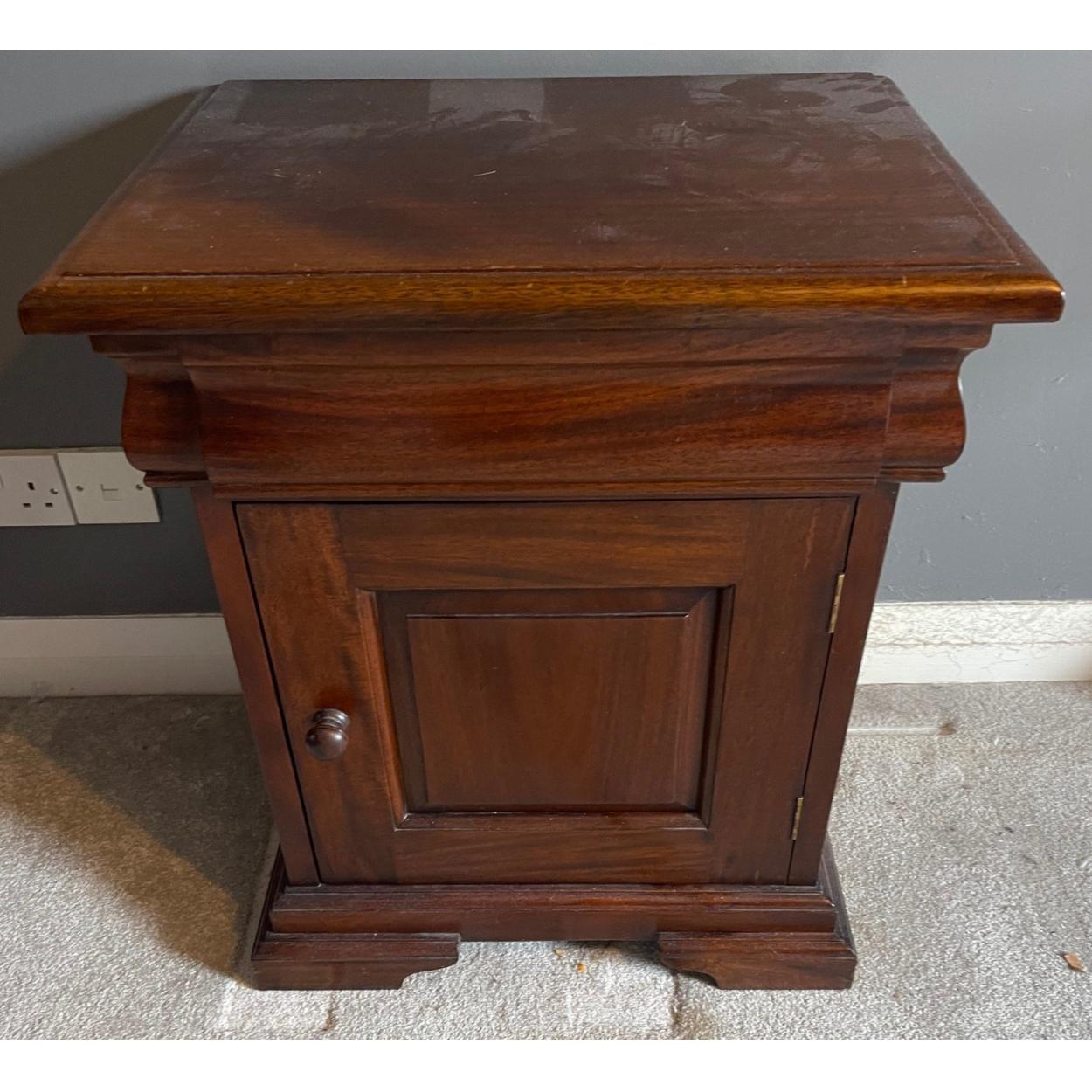 A heavy good quality rosewood effect bedside cabinet with a slide out drawer and cupboard below. W54cm x D45cm approx