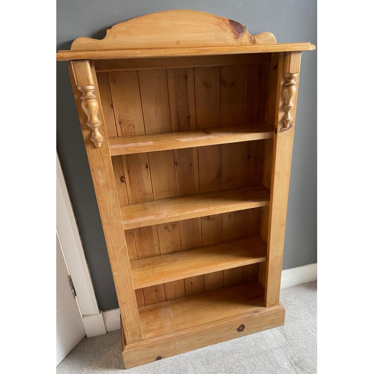 An antique pine effect four shelf floor standing bookcase with decorative mouldings stands 3.5ft tall x 2ft wide x 10in depth approx