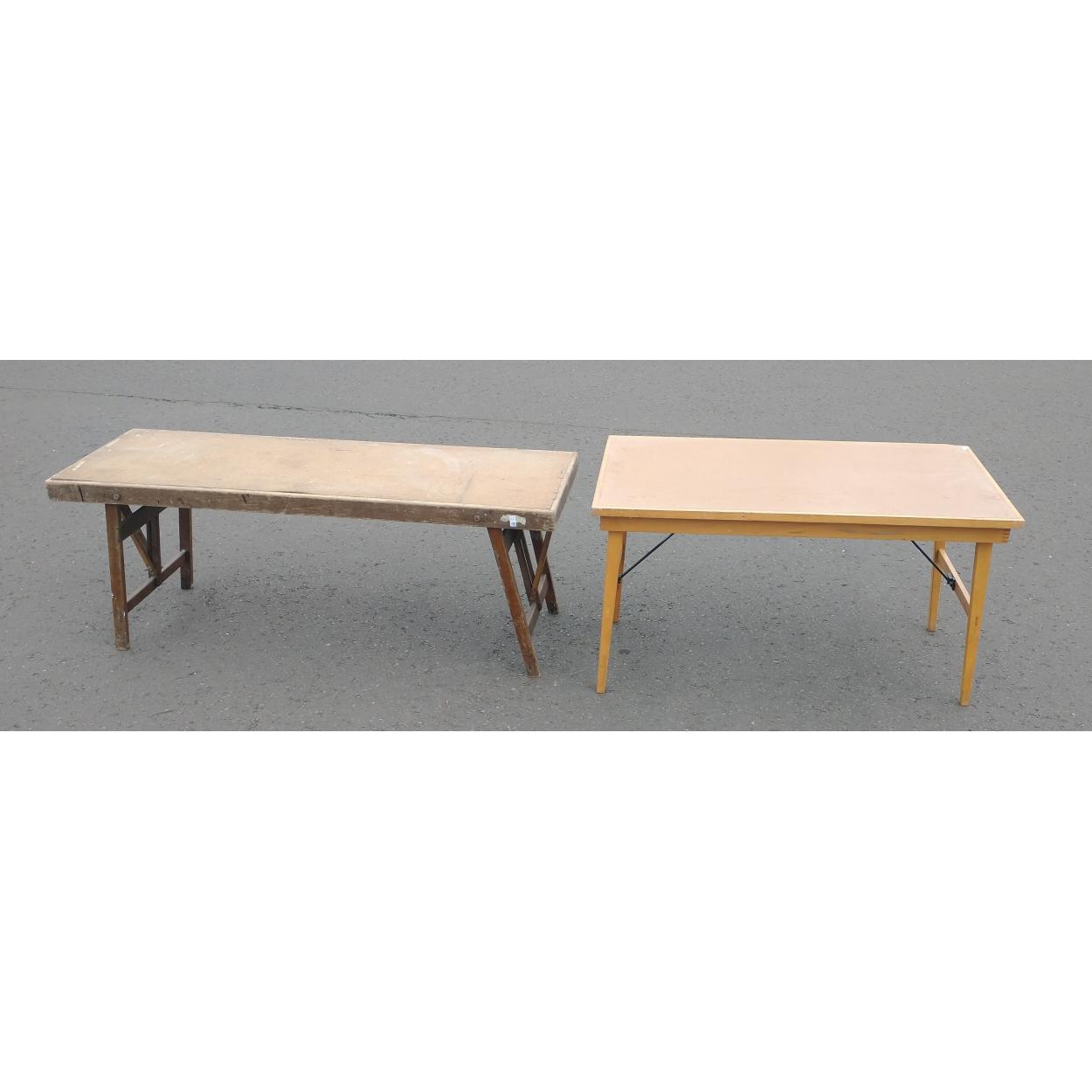 Two useful folding tables both rectangular ideal for boot sales etc. Largest 185 wide x 61cm deep. The small 138cm wide x 72cm deep.
