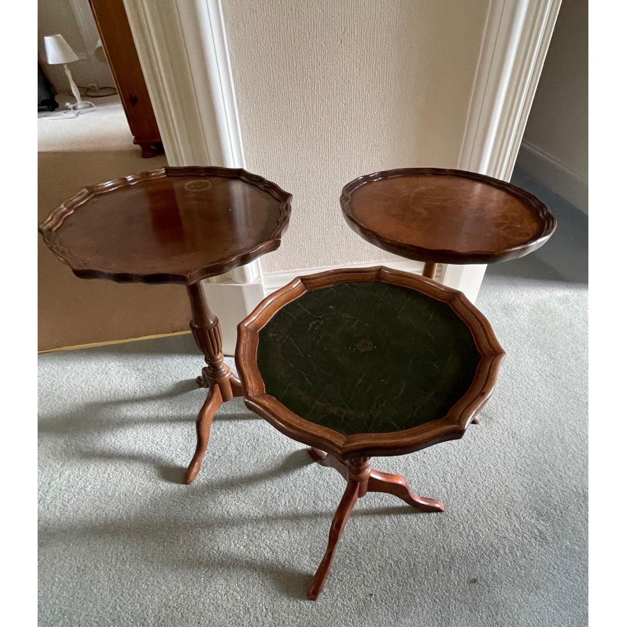 Four pie crusted wine/occasional tables, one with green leather top. Tallest 56cm approx
