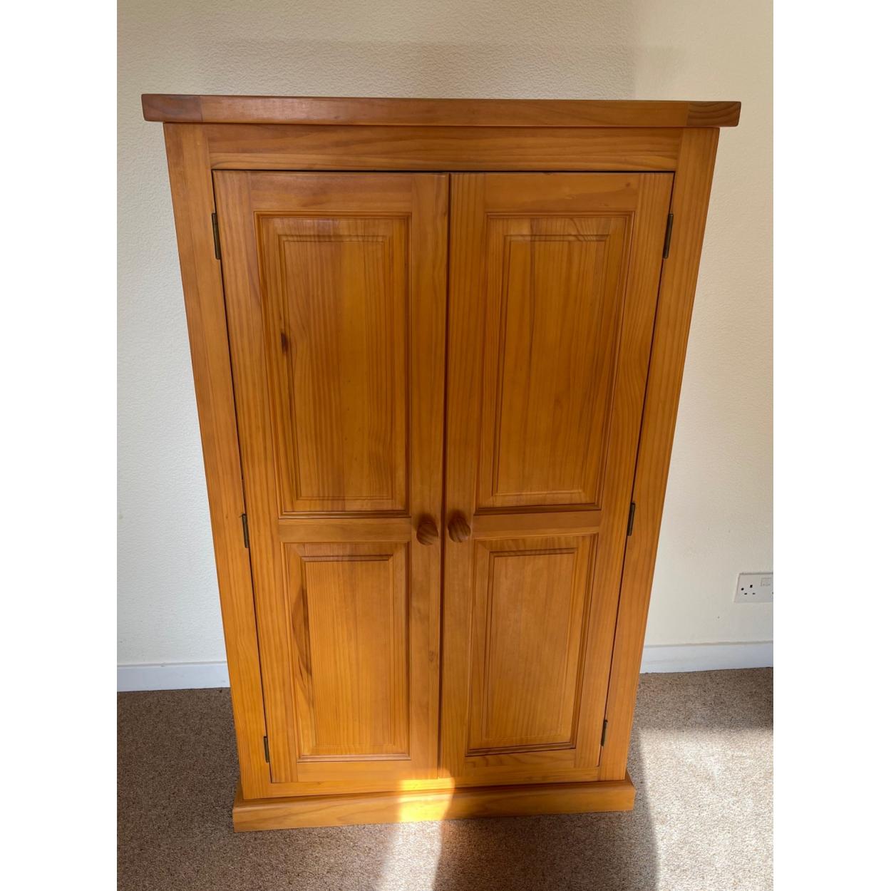 Pine two door wardrobe with internal clothes rail.