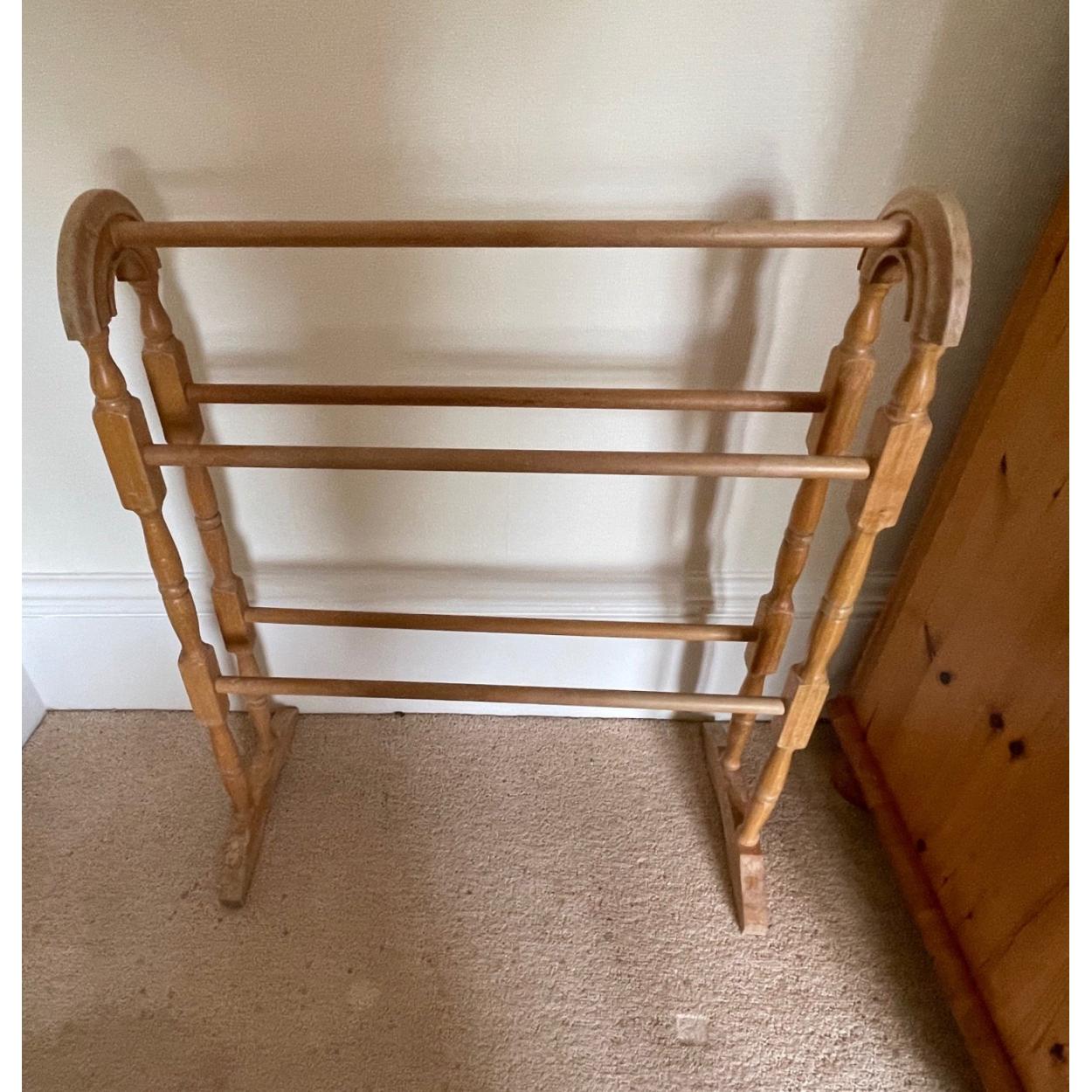 A nice distressed pine floor standing towel rail - dimensions 3ft tall x 2.5ft wide approx