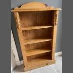 An antique pine effect four shelf floor standing bookcase with decorative mouldings stands 3.5ft tall x 2ft wide x 10in depth approx