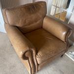 TOP QUALITY an OLDBOOT branded superior quality armchair in soft hide - alas the armchair has some signs of wear on the headrest cushion. This item is around 1 year old W105cm x D97cm x H to back 88cm approx. And also a matching generous 2 seater couch with slight sun fading on top of cushions, otherwise in good condition. W175cm x D90cm x H88cm to top of cushions.