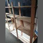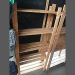 A double width 4 shelf wooden racking solution with metal strengthening rods. 150cm wide approx