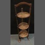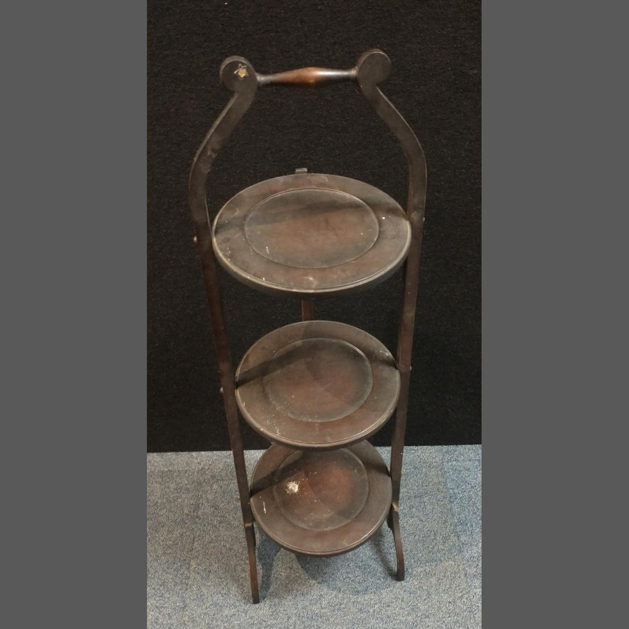 A vintage mahogany 3 tier folding cake standing approx 90cm high. Useful as a plant stand.