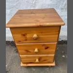 Three drawer antique pine effect bedside cabinet in good condition. 40cm x 40cm approx.