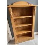 An antique pine effect four shelf floor standing bookcase with decorative mouldings stands 3.5ft tall x 2ft wide x 10in depth approx