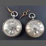 A pair of matched silver cased pocket watches. Both London Hallmarks, one dated 1881 the other 1889. Neither running at valuation. Total gross weight 235g approx. Beautifully finished dials.