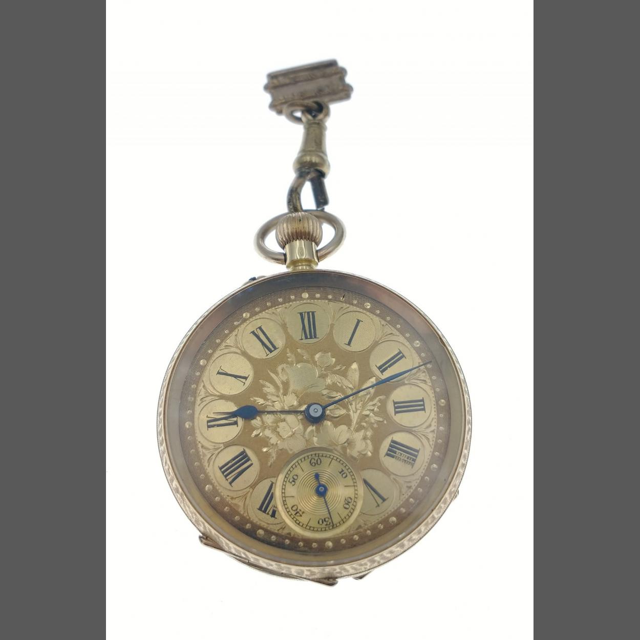 A stunning little 18ct gold stamped heavily embossed open faced fob watch with 18K marks to inside case and to the dust cover. Ticks away well with a gentle wind. 33mm face approx. Presented in a lovely fitted case. Total gross weight 49.7g approx