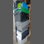 A collection of useful plastic storage boxes in a variety of sizes. Some with lids.