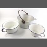 An aluminium jelly pan 32cm dia approx and two enamel bed pans with handles. Good for upcycling as plant pots or indeed for intended use.