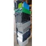 A collection of useful plastic storage boxes in a variety of sizes. Some with lids.