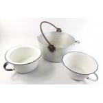 An aluminium jelly pan 32cm dia approx and two enamel bed pans with handles. Good for upcycling as plant pots or indeed for intended use.