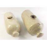 Two antique stone are pig water bottles. Both 30cm long approx, one marked Gray Portobello, missing stopper and one unmarked with stopper.