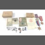 A boxed set of WWII medals sent to a Selkirk man. Award slip shows four medal awards including Burma Star. NB Defence medal missing. Also includes Selkirk Masonic Penny and a Catholic soldiers travel wallet. Poignant little group.