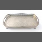 A wonderful heavy gauge silver plate on copper gallery presentation tray on ball and claw feet. Cartouche inscribed with ''Presented by the Captain and Officers of HMS APOLLO 12th December 1981''. 41cm long and in good condition. A lovely naval memento.