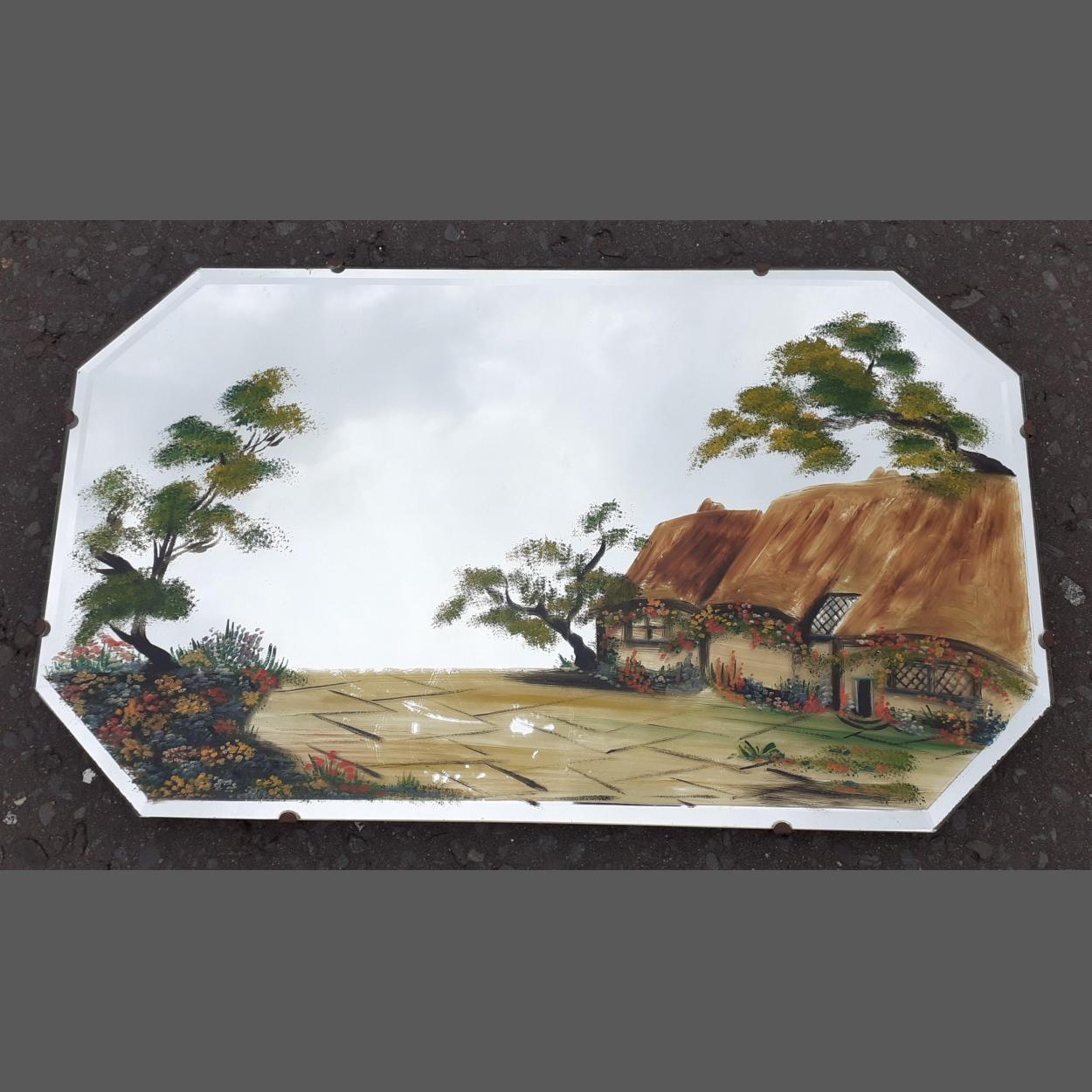An antique mirror with painted pastoral scene. Pretty and useful piece. 56cm x 33cm approx