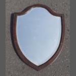 A shield shaped antique wooden mirror with bevelled edge. 60cm tall approx and in good condition.