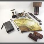 An interesting mixed lot to include studio pottery ashtray, vintage camera, gold rimmed antique glasses, two boxed dress watches (Citizen and Shaarms), fan and others.