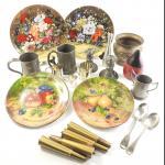 A mixed lot of decorative items to include collectors plates, several pewter tankards, pewter candle holders, Indian brass bowl and others.