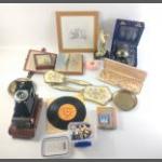 Mixed lot of interesting items to include table mats, boxed plated tankard, Kodak Brownie, Wallace and Gromit figures and others.