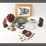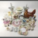 Mixed box to include small quantity of costume jewellery, egg holders, tankard, eggshell soy sauce dishes, Russian doll, key chains, painted butter dish and others.