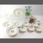 A mixed box to include a part dinner set comprising 6 side plates, 6 twin handled soup bowls and saucers, sauceboat and underplate, sandwich plate, 1 bowl plus various glasses, coasters etc