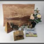 A mixed box to include 3 HUMMEL figures, a Swiss musical chalet, a squirrel shaped nut bowl, a metronome, fabric rose plant, terracotta 'Welcome' plaque and a large sepia print of the Royal Scotsman in a water damaged condition