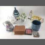 A mixed lot to include a cream coloured dial phone, wooden lined jewellery box with elephant motif, jug, teapot, Middle Eastern style hanging candle holder etc