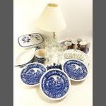 A mixed box to include various mugs, blue and white china, a table lamp, wine glasses, 2 gratin dishes etc
