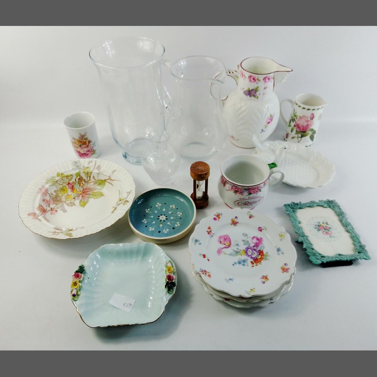 A box of mixed ceramics plus a large glass vase 25cm tall, and a large glass jug