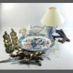 A mixed box comprising a collection of horse brasses, plate display stands, a blue and white table lamp and a large platter decorated with birds of paradise (46cm length)