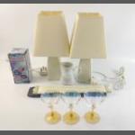 A mixed lot to include a pair of cream bedside table lamps 32cm, a cased slide rule, drill bit sharpener, three pretty glasses and a cream jug.