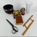 An attractive wooden bowl with metal banding, a crystal glass vase, pair of dress-making shears, a 1984 Selkirk glass paperweight 'Spindrft' a draughtsman's rule and some books of Scottish interest