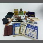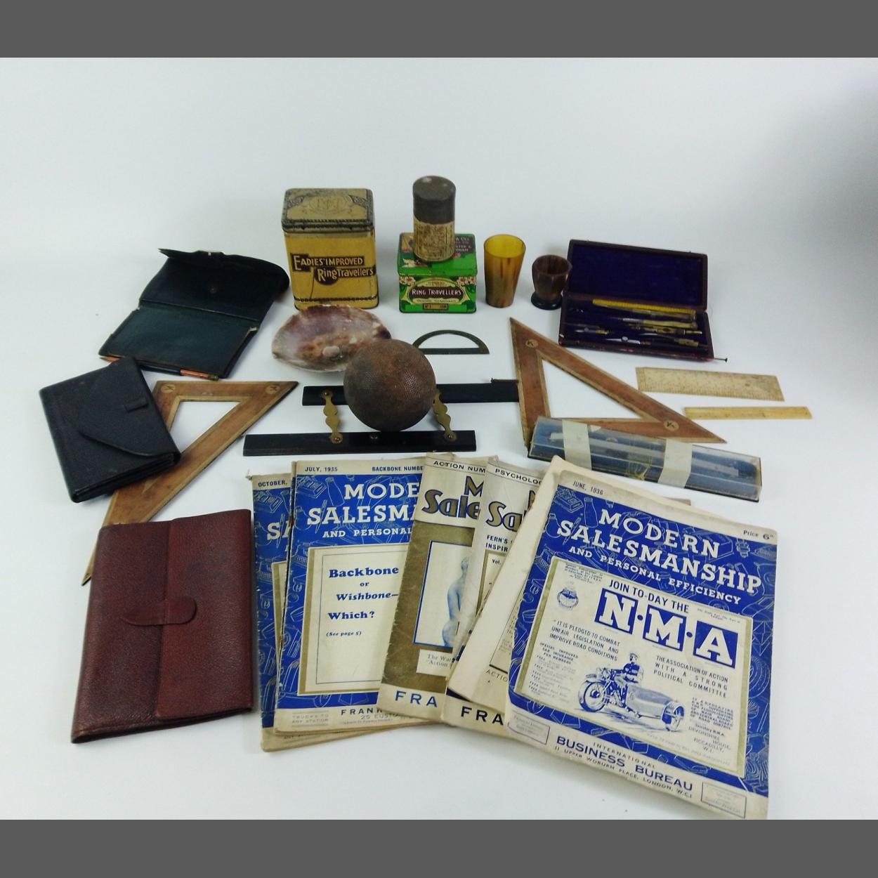 A mixed lot to include some useful folding wallets, a draughtsman set in a box, other draughtsman's tools, engineering magazines with a couple of maps, carved treen bull, 2 horn cups, 3 pretty tins,