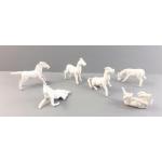 A cute collection of six small white ceramic horse models. One with damage. Largest stands 7cm approx.