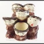 Cheeky (German?) FRIARS / MONKS CHOIR pottery egg holder unmarked but likely to be WEISS. Lovely humorous little group 12cm high. A few minor chips to paint but displays really well.