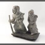 An un-named enigmatic pair of FRENCH CLAY MONKS weathering a storm clate 1950s/60s, artist unknown, dressed as monks standing 20cm tall approx
