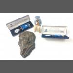 Two ROBERT BURNS 250th anniversary medals in presentation cases plus a cast plaque 17cm long, and a plaster TAM O'SHANTER 11cm tall approx