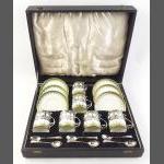 A superb STERLING SILVER mounted coffee can set with matched hallmarks and spoons for Sheffield 1934. Silversmiths Cooper Brothers. Cans and plates by George Jones. One saucer and two cans with historic crack marks but the set presents very well.
