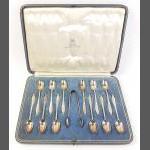 STERLING SILVER set of twelve teaspoons and matching sugar nips. Hallmarks for Sheffield 1935 makers Thomas Bradbury. Very nice condition in Glasgow Buchanan Street retailer's box. Total gross weight 195g approx.