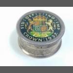 A silver hallmarked pill box topped with a 1937 enamelled crown, 40mm dia approx.